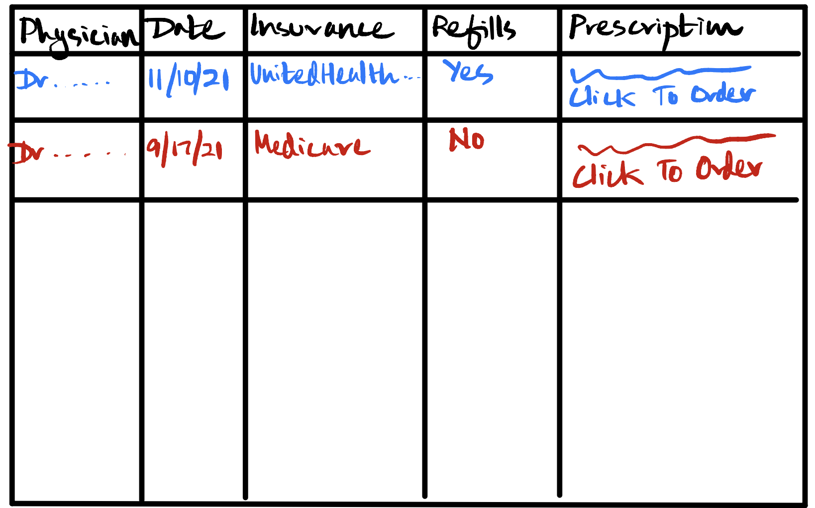 We decided to independently brainstorm 4 different possible designs. The idea behind doing this was not to have polished designs but rather to reflect as wide a variety of screens and layouts as possible to get ideas flowing. We tried to make sure that each set of sketches showed the key functionalities of NimbleRx, including at least 3 different screens. We made sure to not look at NimbleRx's existing interface during sketching or mockups, attempting to create an original design not based on anything the company has done so far; and again, we are aiming to address the problem the startup is working on. The slideshow frames below for each design have "buttons" at the bottom that you can click to access different sketches.
