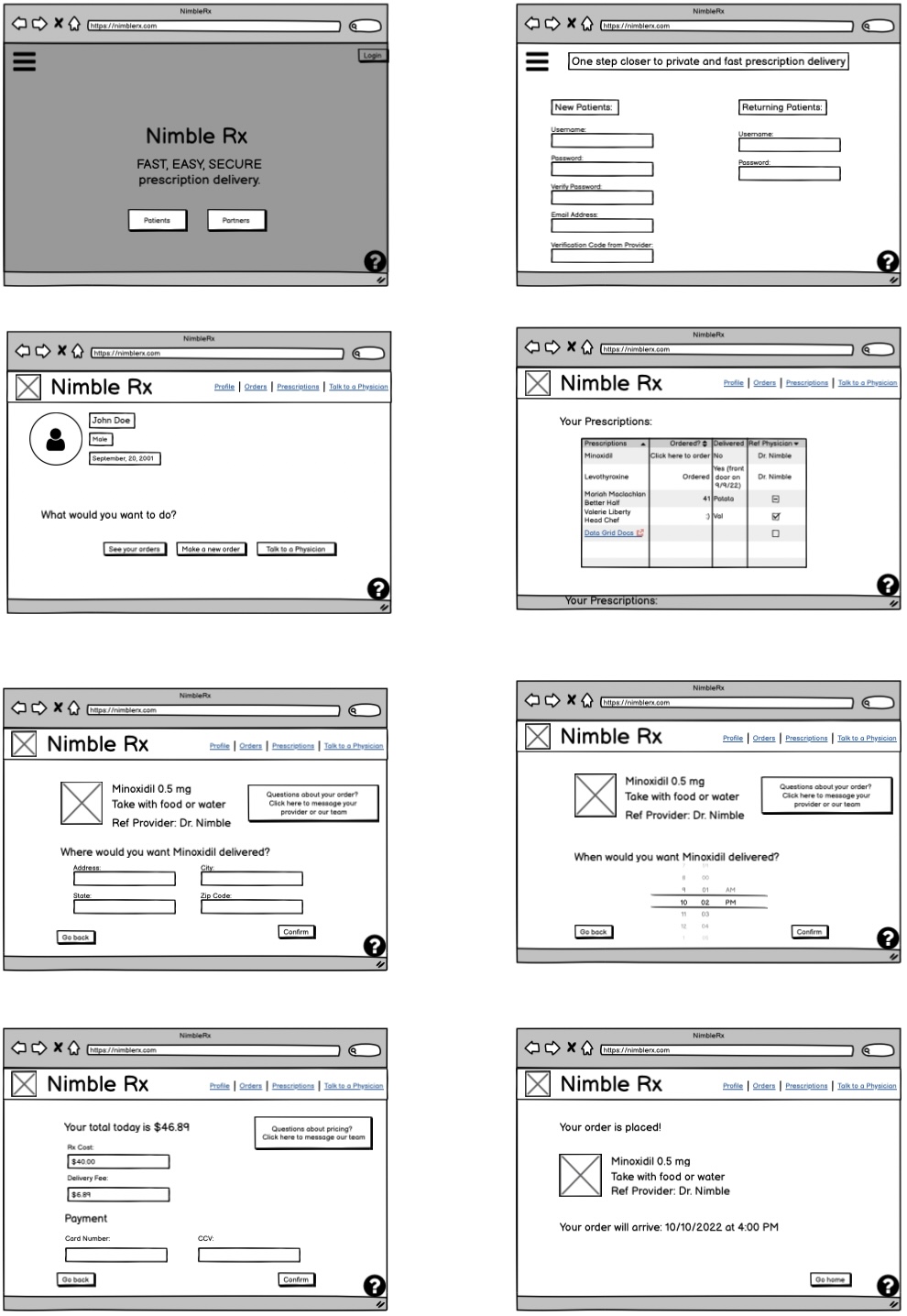 Once we finished sketching we had a discussion to make sure that the sketches demonstrated solutions to NimbleRx's goals as described in their blurb (i.e, making sure the sketches are effective at solving the problem) and that they reflected creative ideas and alternate solutions to NimbleRx's goals that were substantially different from one another. After this discussion, we made a single set of wireframes that combined the best aspects of all of our designs and incorporated the feedback that came out of our discussion.